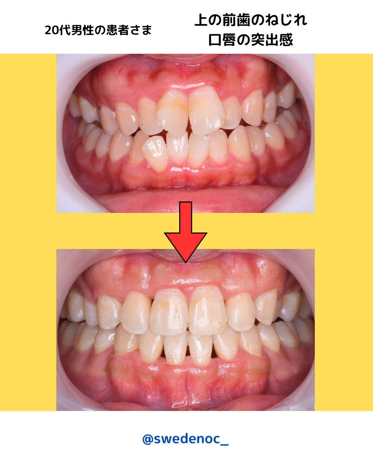 20代男性、主訴「前歯のねじれと口唇の突出感が気になる」